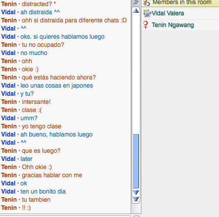 - I spoke with two people but I forgot to screenshot my other chat because I accidentally quitted out of it. I had a nice long conversation with Rafael from Brazil in spanish. He was helping me a lot too but anyway, the chat that I've screenshot is the one below. His name is Vidal and he was from Venezuela.What did you learn about them? What did you learn from them?