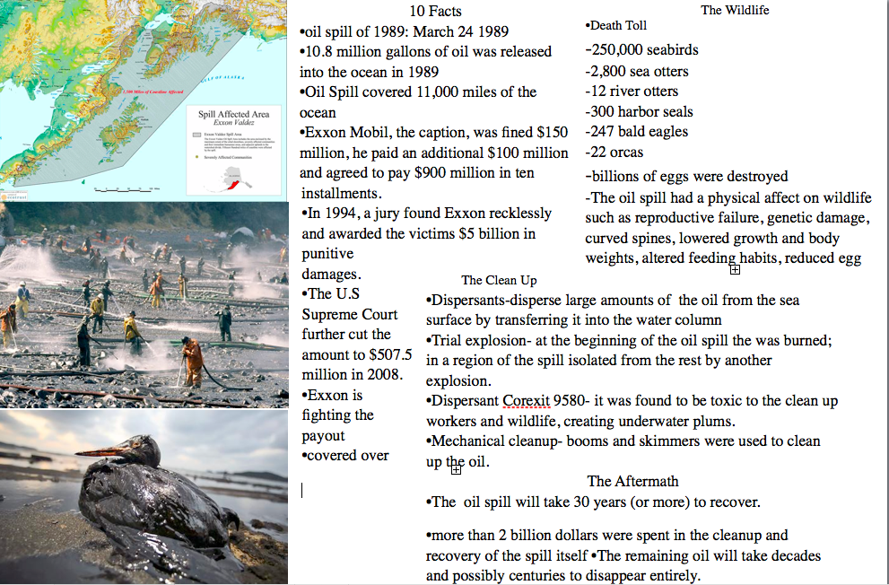 Refection: This project was really cool to learn about because I didn't know there was a oil spill in the 1989. I learned a lot about what happened and would love to learn more. I like reading about animals so I was really interested in the project. Even though my group had to do it over 3 times, we never stopped working.