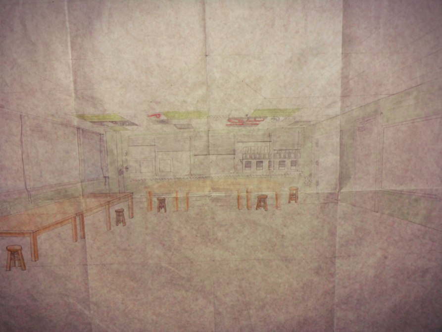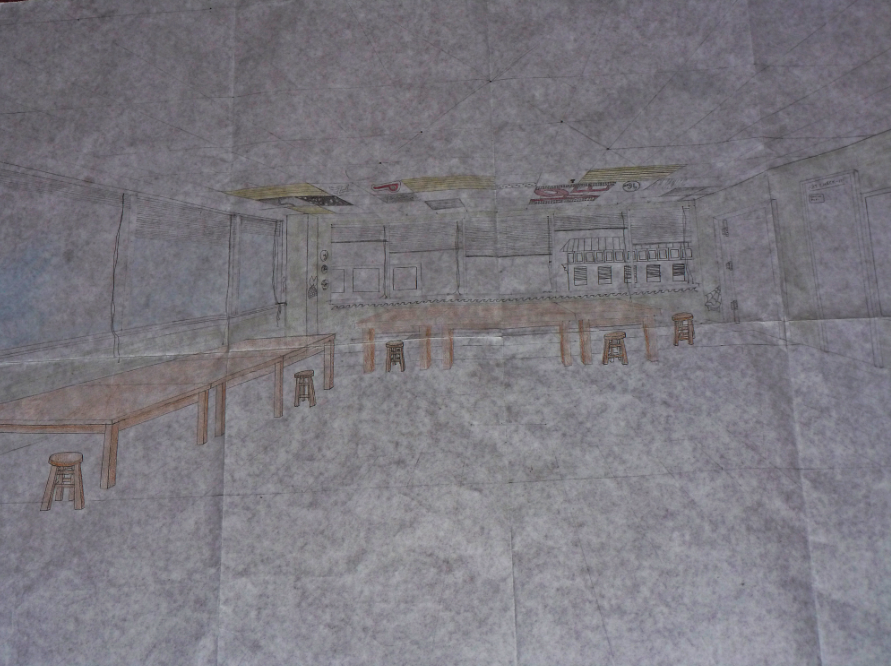 I think if I did the assignment again, I would definitely take more time to finish the actual drawing before doing all the details. I started drawing everything on the ceiling tiles before I finished drawing everything else, and it made it hard to finish at the end because I was running out of time. I would definitely need to use my time better, because it was really stressful at the end, especially because I had to color in the entire picture at the end. Coloring my drawings is usually not my style, so I just added a few bursts of color in certain areas such as the tables, stools and wall. I also added a small amount of color in certain ceiling tiles. I was actually pretty proud of the outcome.