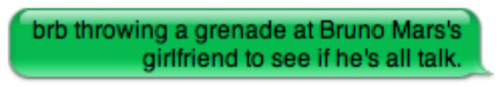 Grenade by Bruno Mars. Posted by Morgan Craig-Williams in Storytelling - Chase on Sunday, April 24, 2011 at 11:12 pm I thought this was simply hilarious, I had to upload this.tumblr_lk6t91LBnw1qhxrsqo1_500 Comments No comments have been posted yet. Log in to post a comment.