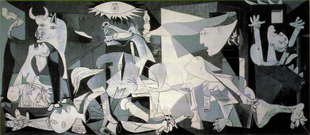 La pintura que estoy viendo que tiene la nombre Guernica, es una obra de la pintor muy famoso Pablo Picasso. No hay muchos colores, solo es blanco y negro, pero hay muchos tonos de gris también si usted piensa es una otra color. Los colores de la pintura son pocos apagados. El tono de la obra de arte es un poco deprimido, pero, en el mismo tiempo lo tiene un tono de esperanza. Pienso que es un poco similar a la escena que yo viste cuando y fui a visitar mi amigo Machuca después de cuando el General Pinochet tomó el poder. Pero un diferencia que puedo pensar de, en esa escena no vi nada de esperanza como el flor, la vela, o la bombilla.