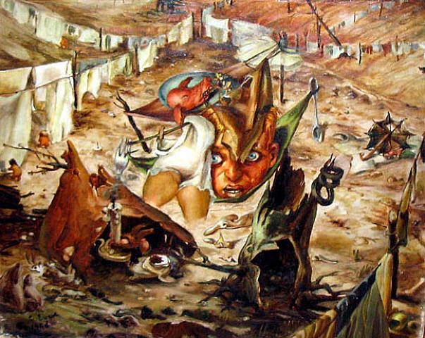 También hay una cabeza cortada de cerdo que tiene un flor en la boca y esta en un plato. Este cabeza está en una hamaca también. Las hamacas están soportando por vajilla de plata como un tenedor y una cuchara. Hay escombros en el terreno. Hay una paragua negro. Los arboles se ven muertos y huecos. Lo me parece de muerte. Uno de ellos aparenta como que hay una carpa y hay algas entre lo. Creo que miró un perro, o posible un chacal, que tiene una vela en la boca.
