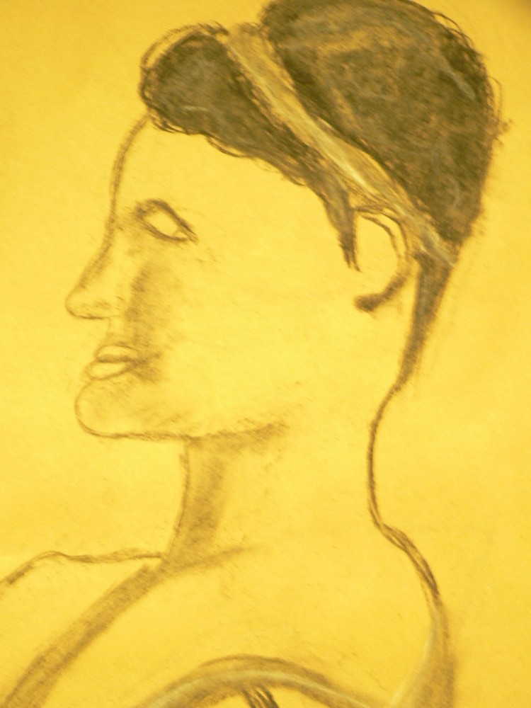 This is the result of my bigger self portrait. I've come to the conclusion that drawing big isn't my strongest point. This was also supposed to be done with charcoal. The outline of the drawing is, but I didn't shade or do anything to make it "pop" form the page. I get scared that if one mistake and the whole thing is going to be ruined. So I try to make them as simple and basic as possible. I'll eventually add more to the drawing, if I have time. For now that's what it looks like. I'm sort of pleased with it. In a way it resembles me. [Click image for bigger more clear picture]
