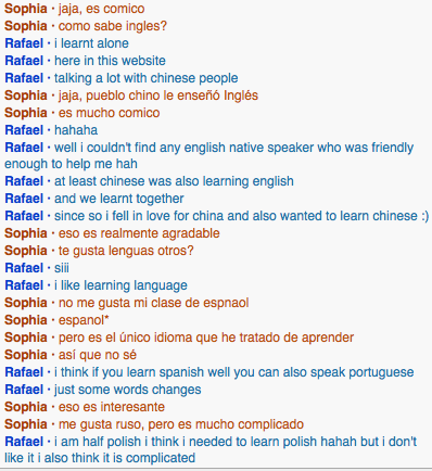 I learned a lot about my partner in this conversation. We had a very good conversation that progressed as one would between two native speakers of any language. I discovered that my partner Rafael(19, Brazil), very much enjoys learning other languages and has a great love for China. He's also part polish and likes learning about astrology.