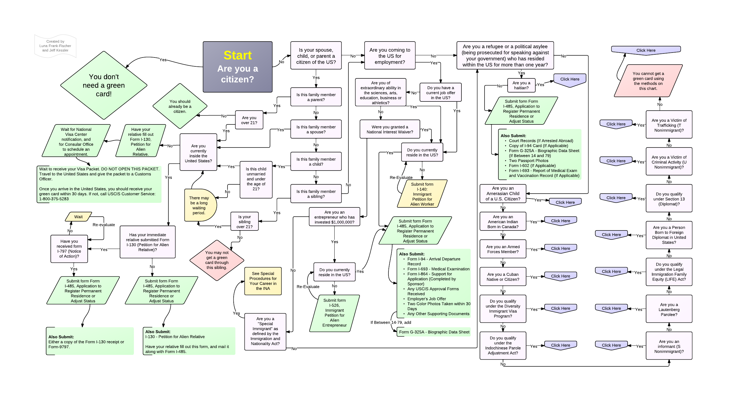 Jeff and I first made the flow chart, dividing up the various routes to a Green Card between the two of us. I worked on getting a Green Card through family members, which has, in itself, various sub-options. The paperwork had two parts, and so we split that up. I filled out the shorter post, and spent extra time making our flow chart colorful and well-formatted.