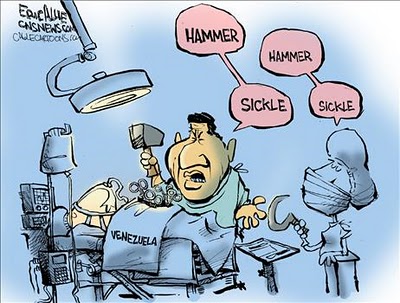 En la foto, Hugo Chávez está ayudando a Venezuela, pero no muy suavemente. Yo me gusta la cómica porque Chavez está no suave, él es muy energica, y él no tiene una idea lo que es ser cuidadoso. Chavez está muy audaz, y que lo hara él usar un hoz y el martillo.