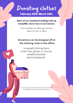 For my Capstone, I created a clothing donation drive inside the school building and also had a similar setup outside of the school in my own neighborhood. For the in school one, it lasted around a month and had many students and teachers donate all kinds of clothes during February-March. Some of the acceptable clothes were T-shirts, Hoodies, Jackets, Pants, etc. While the one I had created in my neighborhood was a little bit of fundraising where I went door to door asking people for possible donations to the Klein Life organization to help all the families who have fled Ukraine. I hoped to show the importance of donations through these tasks and wanted people to see what good can come out of them.