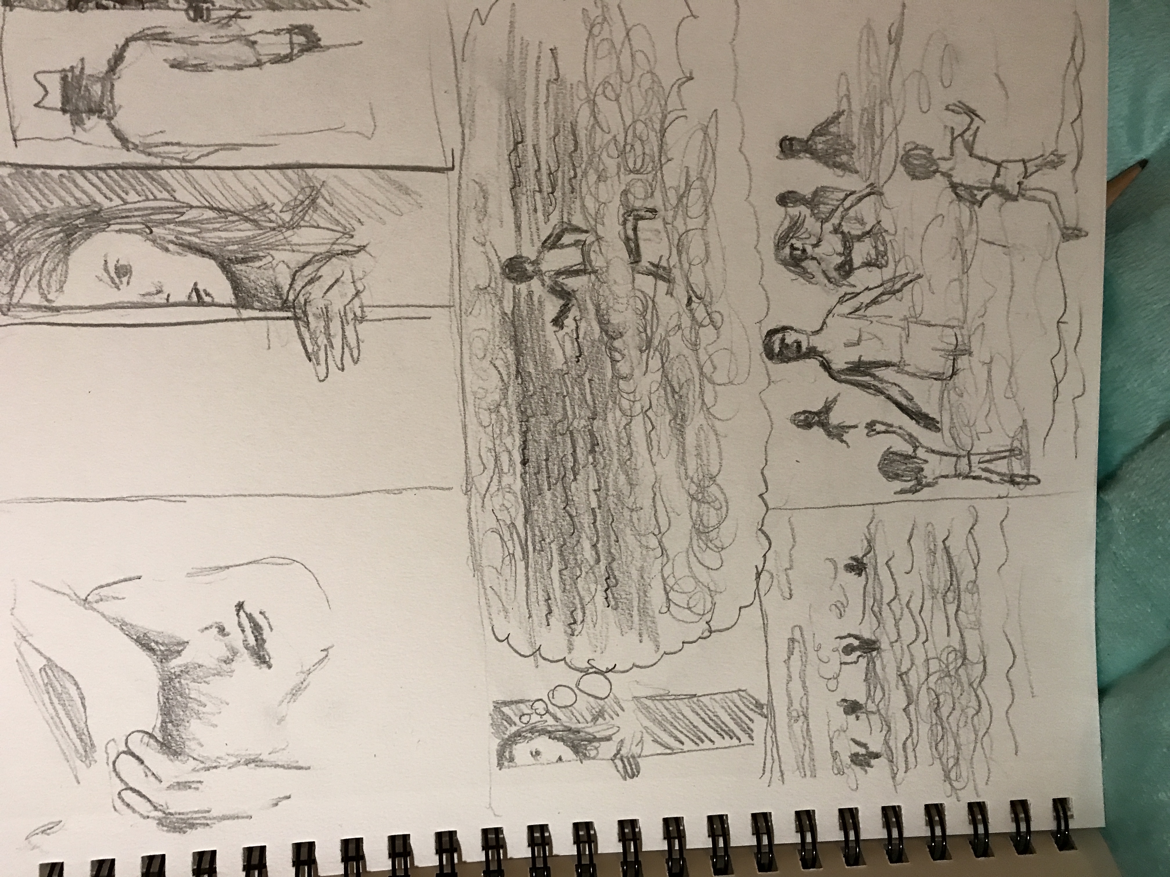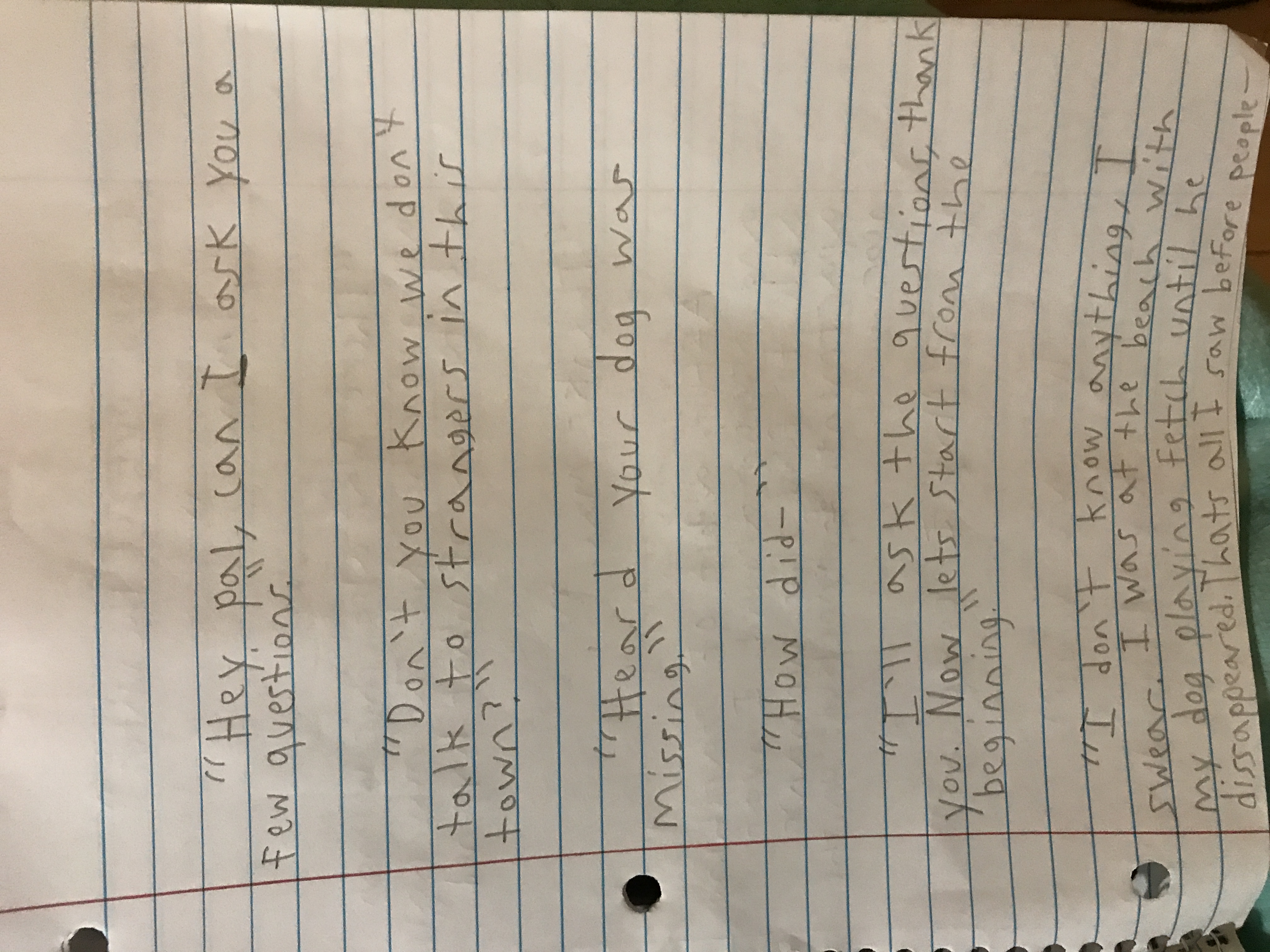 In my storyboard, Roy starts gathering information by investigating the raft washed up on the beach. Roy then decides to ask some locals until he stumbles upon the guy who lost his dog to the shark. The two engage in a conversation but the man is unwilling to talk until Roy asks if his dog was missing. The information Roy receives from the man then eventually leads him to the woman who lost her son to the shark. After asking her, she tells Roy, causing a flashback to occur. She tells that on the foggy day at the beach, when Alex went into the water with the other kids, things seemed alright until she noticed the commotion picking up. Everyone ran to the edge of the water and the kids all ran back to the shore. All except for Alex who never returned.