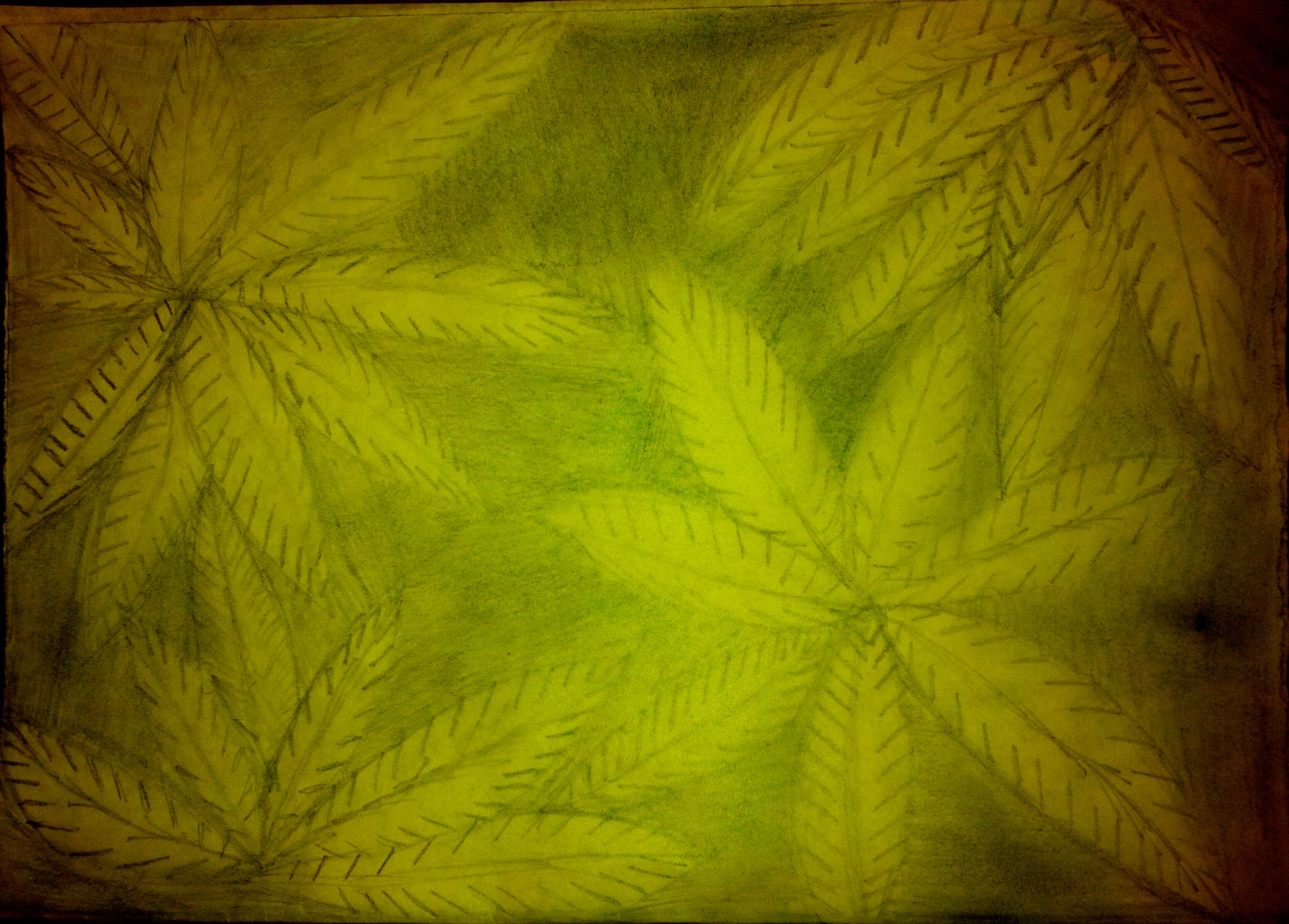 During class one day, I doodled in my book. Excuse me, I found a project I could turn in for Advanced Art however. I drew a leaf. A very pretty leaf, one that is of elegance. Haha. This leaf then bloomed into flowers of leaves. In my notebook I tried doing this in pencil and in pen. I personally felt more connected to the leaves drawn in pencil. That started this piece right here. I first started with one leaf and started making bunches of flowers all over the page with them. I loved the pencil so much I kept it just like this. Because I had chosen a yellow flimsy piece of paper to work on I wanted to add a touch of shading and smudging of pencil to fill in such openings. The piece turned out to be very good in my opinion. I loved even more how it came about just by the boredom of a class for me.