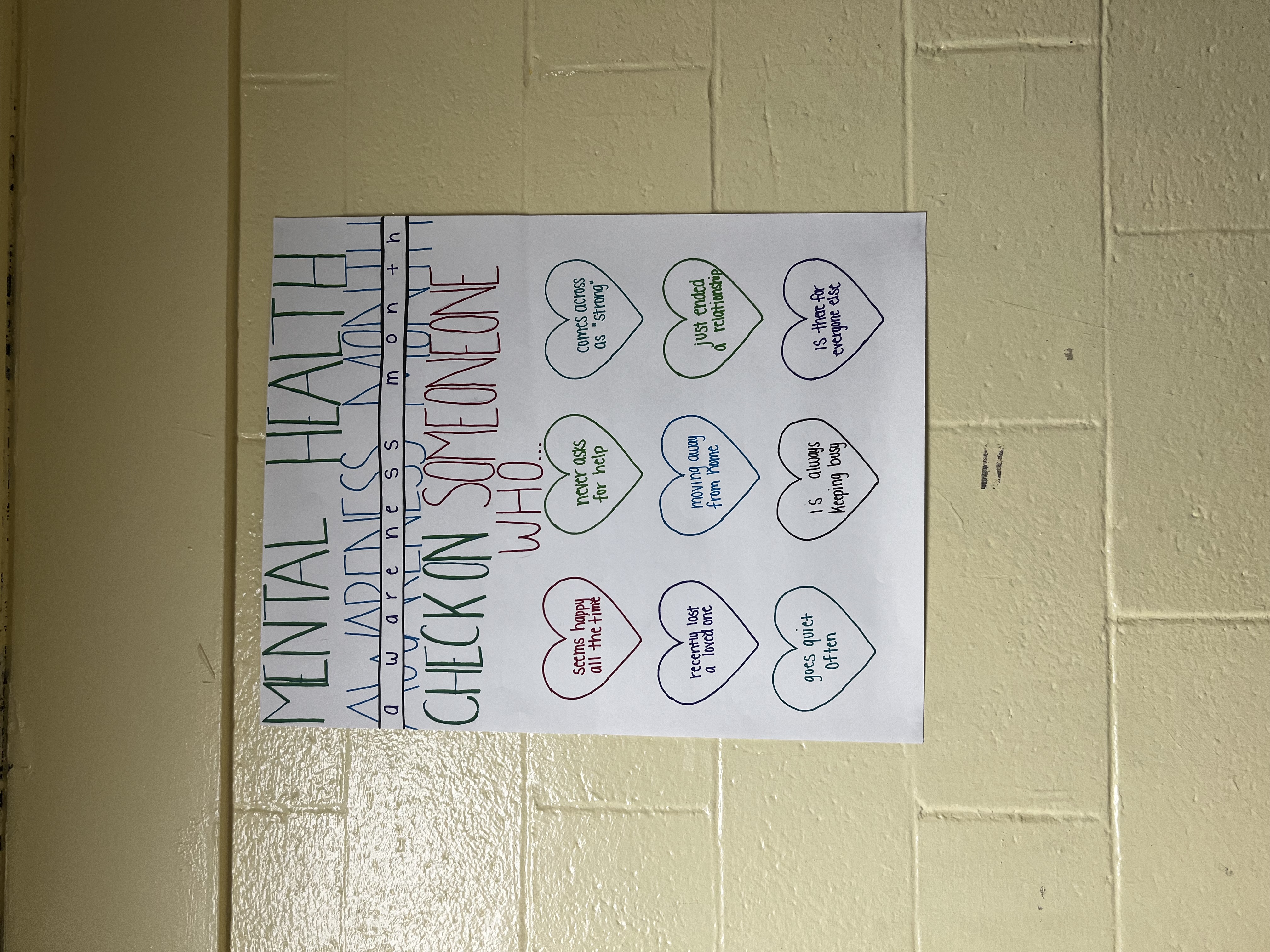 For my Capstone, I chose to focus on the topic of Mental Health and made “Mental Health Awareness Check In”. Mental Health Awareness is very important especially within a high school. Especially with the transition period from pandemic back to a “normal life”, it is hard because we were so used to the lack of social interaction. With us, high school students, trying to navigate high school after such a mentally draining time took a toll on us. So I thought of the idea to post Mental Health Check In posters around school so that it gives the students and/or teachers a space to check in with themselves. After doing research on each of the mental illnesses, I learned how much each illness can affect people and the age group that they fall in. After finding out this information, I thought it was important to do some sort of check in to where students or teachers didn’t have to necessarily speak out about how they felt to make them feel uncomfortable but to be able to show it without anyone knowing it was them. My goal overall was to help the SLA community understand that our mental state is very important and that it’s okay to not be okay at times. Also to let them know that there are people here that they can talk to about anything that’s going on with them.