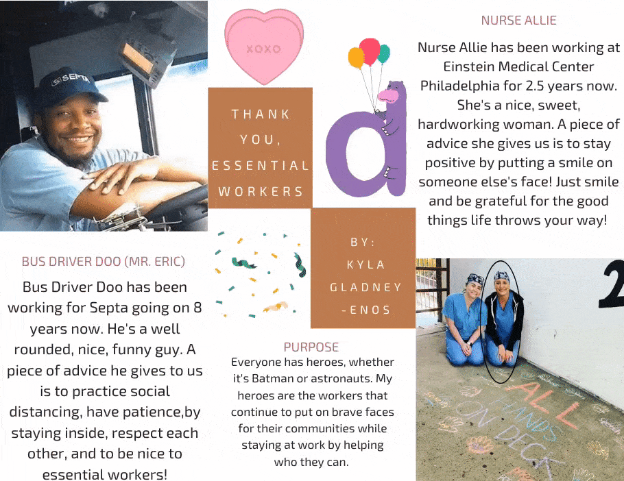 For my capstone, I knew I wanted to highlight workers who constantly put their lives at risk to help their communities. I was originally going to photograph them and hang their pictures in a gallery, but unfortunately, that was unable to happen due to COVID-19. Instead, I gathered photos on Instagram. I then chose the best ones and made a collage! I contacted two workers and asked for their name, where they work and how long they've worked there, and a piece of advice they have! Enjoy! https://docs.google.com/document/d/1WbmiyojG81ENIFxnhCJpYoKTK_Kybl04MWi5wnPZvSs/edit?usp=sharing Here's the link to my paper! https://docs.google.com/document/d/1tRYQQ6-pQ91XFWwCDfNTAeT9GrclLa8lz50GoA2hhRs/edit?usp=sharing Here's the link to my bibliography! https://docs.google.com/presentation/d/19Dr8x1hgO36adbRrW2xNs-d9ATH2coMyLMqeQyhanOs/edit?usp=sharin Here's the link to my slides!