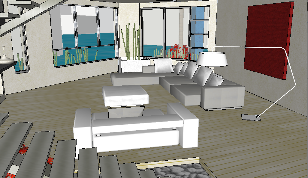 La sala es muy grande. Está cinco sofás, tres mesas, una lámpara, dos pinturas, cuatro plantas, está trece ventanas, una tele, y una escalera.