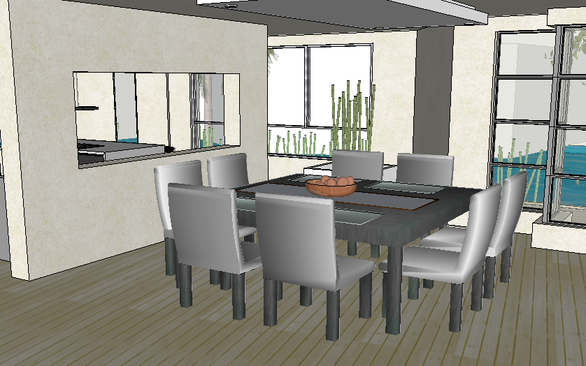 El comedor es pequeño. Está ocho sillas y una mesa.
