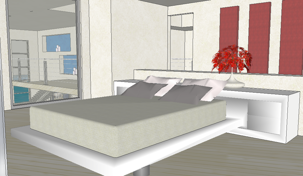 En él cuarto, es pequeña. Está una cama, tres pinturas, un plantas, y una mesa.