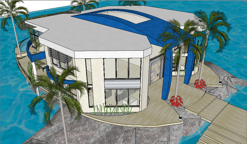 El patio está muy grande. Está dos camas, tres sillas, dos sofás, dos mesas, una piscina, un bañera de hidromasaje. También, está un barco. El barco es de color blanco y azul. Hay un pequeño muelle para el barco.