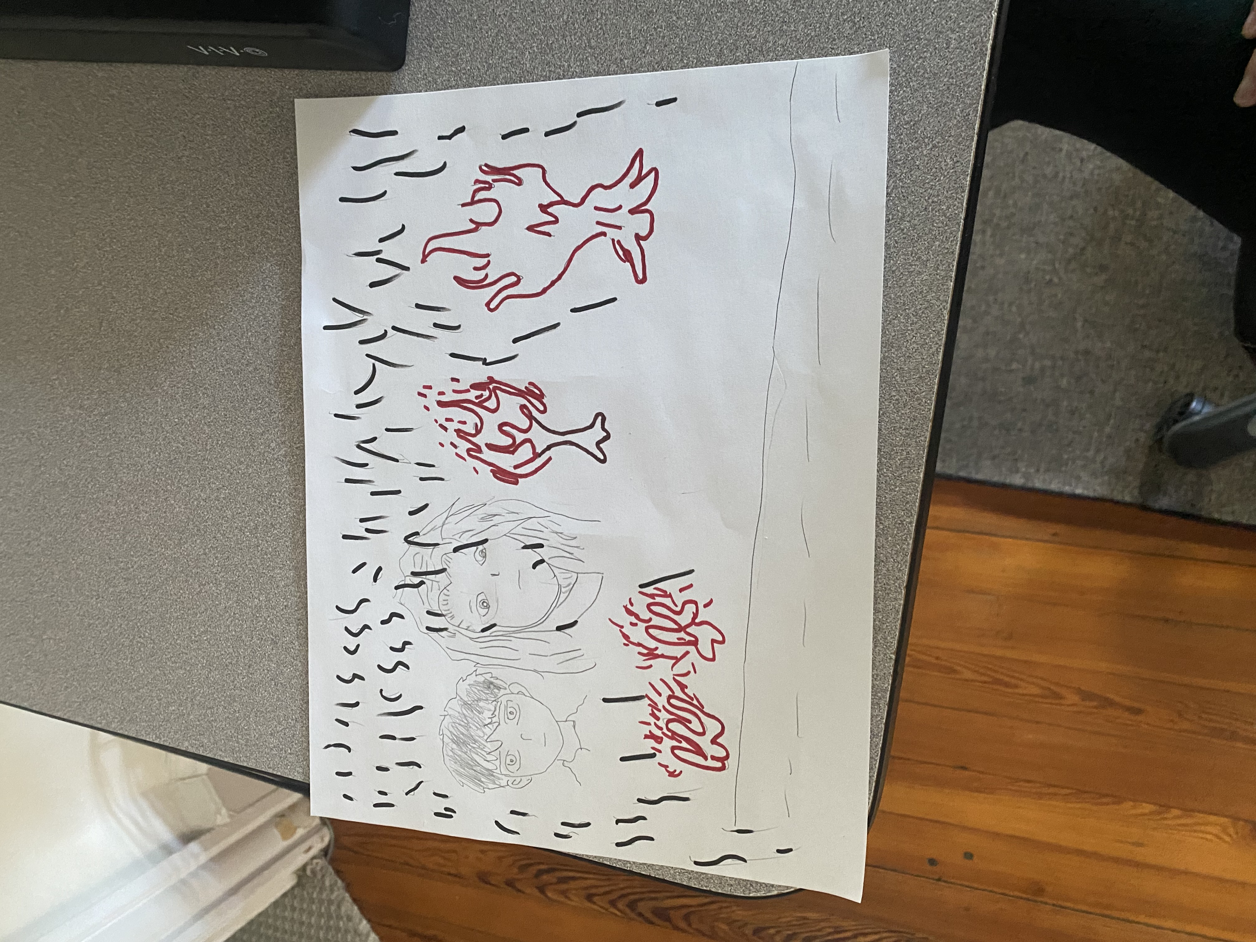 The scene I drew for my lit log is just when the dad and son and dad are watching everything burn and the ashes are falling on them. Maybe when they are talking about everything that is happening and the dad is coughing because he is really sick. I drew the dad and the son and then the black lines are the ashes there is the road at the bottom and I drew some burning trees. This scene can mean a lot because it really shows what the book is about.
