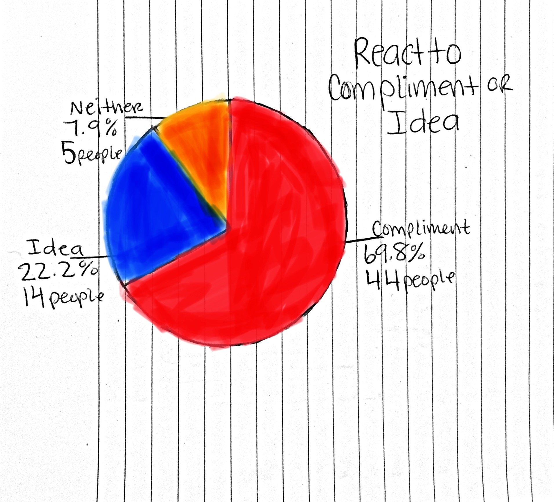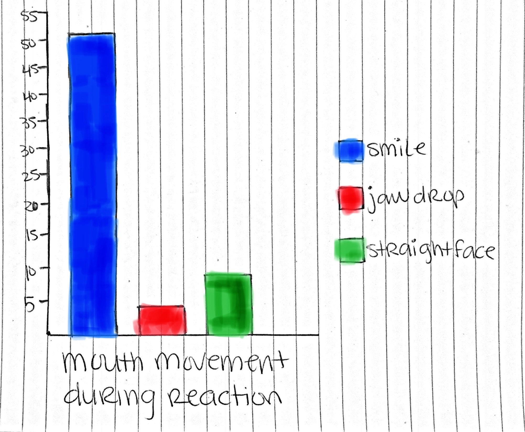 My initial influence for the topic of this project was a video I came across on Facebook a few years back. It was about a girl who recorded the reactions of her classmates to her complimenting them. Although the basis of my project is the same as her’s, I decided to take it one step further by analyzing and graphing them different aspects of their reactions. Throughout the process I had a bit of trial and error where I realized that if I told some of my peers I was taking a picture rather than taking a video, they would stay still rather than react. On top of that, while analyzing the reactions I attempted to graph three different physical aspects of each person’s reactions; their mouth, their hands, and their eyes and there ended up being too many different motions to categorize them efficiently. Overall, I think that after my trials and errors I came out with a project that I’m happy with and proud of. My favorite part of this entire project was that I got to contribute to my community and hopefully make some people smile and feel happier than they were. It made me feel good to compliment people even if they didn’t seem to appreciate it but also, the people who had overwhelmingly positive responses, I was so happy to have made an impact on them even just for a minute. Through all of this I learned that small things can make a person’s day but also, my opinion on compliments isn’t too different from others’ and that made me feel more secure in my perspective.