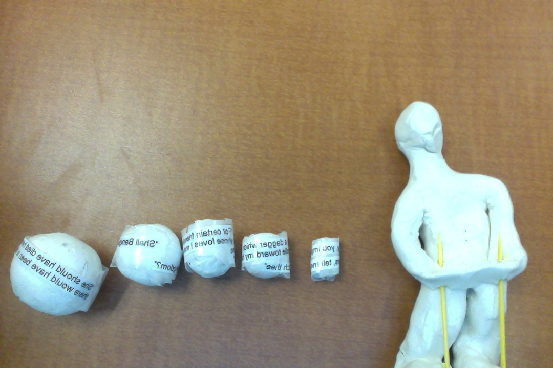 I soon came up with the idea of making a clay Macbeth and quote weights. As the story progressed, each quote weight would be added to Macbeth to show the struggle he endears on his journey. By the final quote Macbeth is no longer able to hold up the weights and therefore falls. This is supposed to show how in the end all of Macbeth's choices finally kill him.