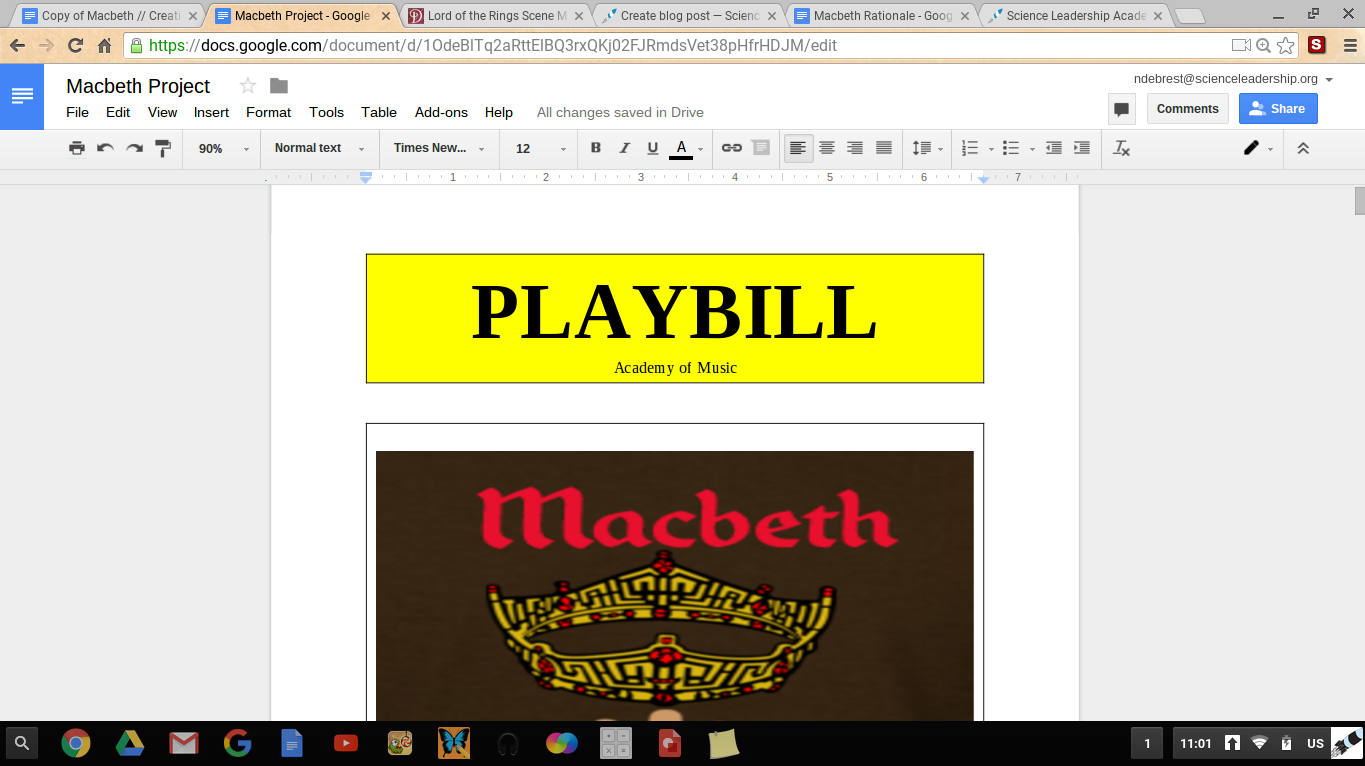 For this project my partner and I decided to make a playbill. We thought that it would be the best way to represent the story of Macbeth. As soon as we came together to collaborate we decided on the playbill. As soon as we started we immediately had ideas for the cover. Our initial idea was to have a hand emerging out of water grasping a crown and then the water fading into blood. I believe that that was a very good idea but it kind of got lost in translation so we reverted to a different cover. We had some trouble with the cover because I wanted a very sleek computer look for the cover. We couldn't find any free graphic design tools we can use online so we had to use the t shirt making website call “Custom Ink”. For a t-shirt website I am very happy with the quality that our cover turned out. Another reason why we picked the playbill is because I immediately wanted to do the costumes. I also one of those to look sleek and I didn't think that drawings could do or just explanations of what the costumes would look like. So I searched and I searched and I finally found a Lord of the Rings dress up game that fit the Macbeth theme perfectly.I made countless avatars that I thought represented the Macbeth characters and what their wardrobe would look like. Since this project was in our hands we were able to put a Philadelphia spin on it by having the play performed at the Academy of Music. We also got to have some fun in the credit part of the playbill. We used some of the Science Leadership Academy staff as our cast and crew for the play. Including Mr. Lehmann and Mr. Gerwer as the producers.I was also drawn to the playbill idea because we had to make actor profiles. With making these actor profiles I was able to make a new version of Macbeth with an ethnic cast. I was also able to make up mini biographies for these actors and actresses and I really enjoyed that. I got to make them a part of any famous musical that I wanted to. During this project me and my partner had some very severe communication issues. We were able to get the project done on time but the workload was not very fair. I really like the organization of this project. It made the project very manageable that the assignments were broken up into tasks instead of one big project at one time. This really help me and my group member be more organized. Even though we did not follow it that much I really liked the calendar idea. All in all I did enjoy doing this project though because we were able to take the play Macbeth and put our own interpretation on it.We hope you enjoy “the show”.