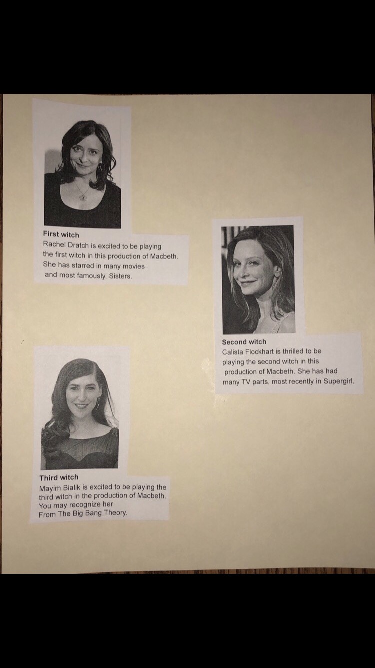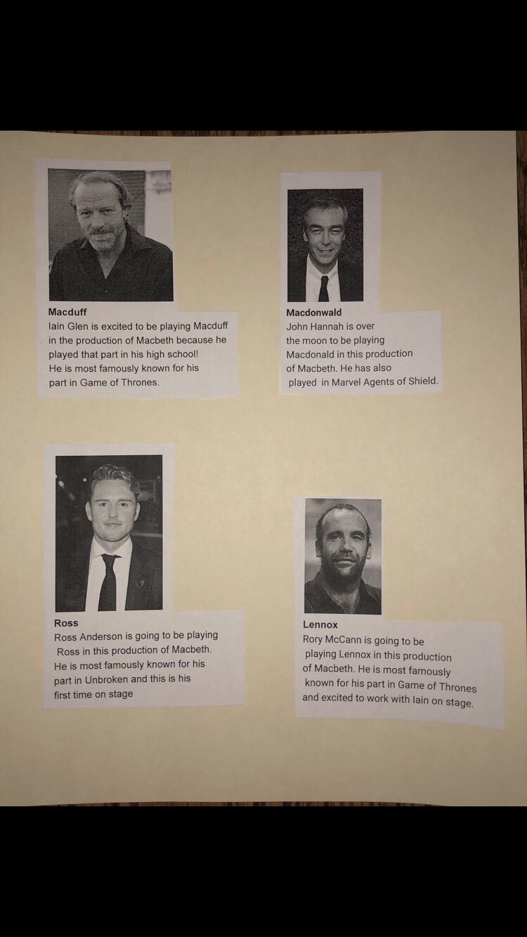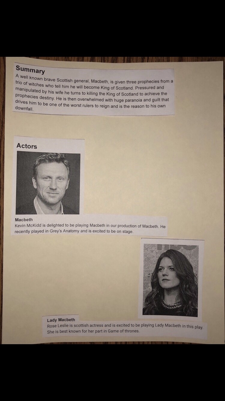 Ash and I made a playbill. Ash and I seperated jobs into twos and did one together. My job was to pick actors and create costumes. I picked the actors by nationality or facial characteristic. I picked the costumes based off of the time period of Macbeth and the roles they played in society. Ash did the summary and the advertisements. The summary is a brief description of the Macbeth play.