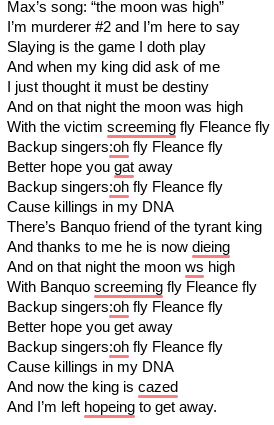 Other names of songs, 1. Double Thane 2. The King 3. The moon was high 4. The Lady 5. Death of Banquo 6. Duncan’s Deed 7. Macduff’s Ending of the king