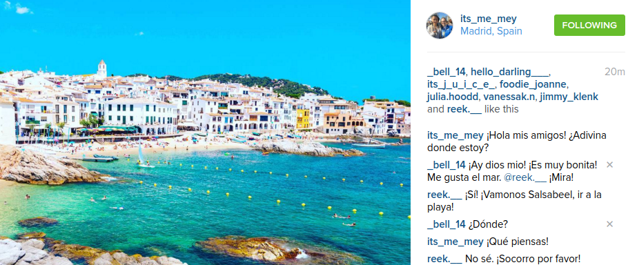 Meymey Seng (its_me_mey) posted pictures of where she visited while in Madrid. She posted pictures of a beach and a museum where her two friends Tyreek Speedwell (reek.__) and Salsabeel Elbakhadaoui (_bell_14) has a conversation.