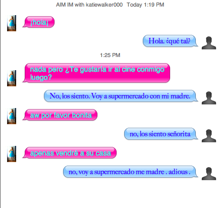 Me and Katie creepy convo Posted by Alyssa Winner in Spanish 1 - Manuel on Tuesday, March 27, 2012 at 1:32 pm Screen Shot 2012-03-27 at 1.28.36 PM Comments No comments have been posted yet. Log in to post a comment.