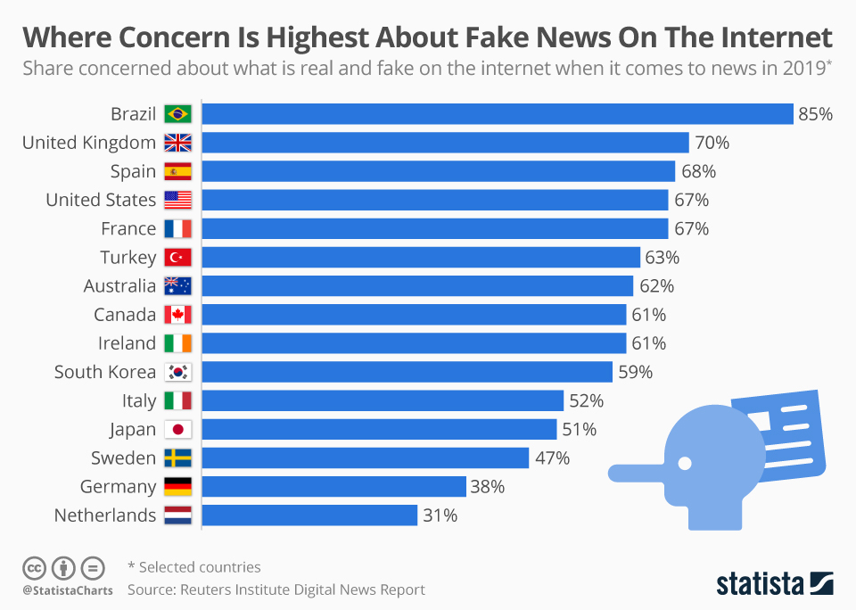 A chart showing the concern of internet misformation in different countries