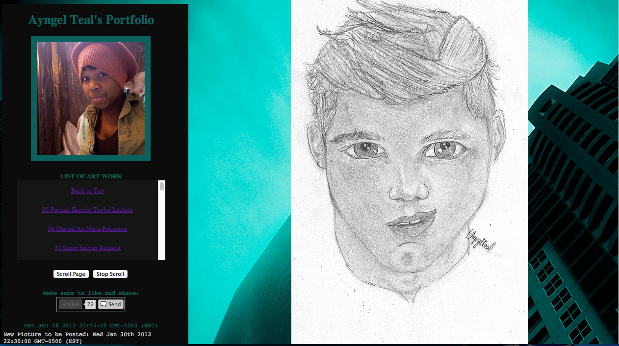 I spent this quarter really working on my web design skills and perfecting my website portfolio because I was informed that it can count (if I want) as a part of my portfolio. Above was my original lay out. In the original lay out I have a small self description, background music option, a comment section, a page view counter, and a slide show of my art. I was okay with this lay out for a while but I was receiving a lot of feedback that I needed to make it look more professional.