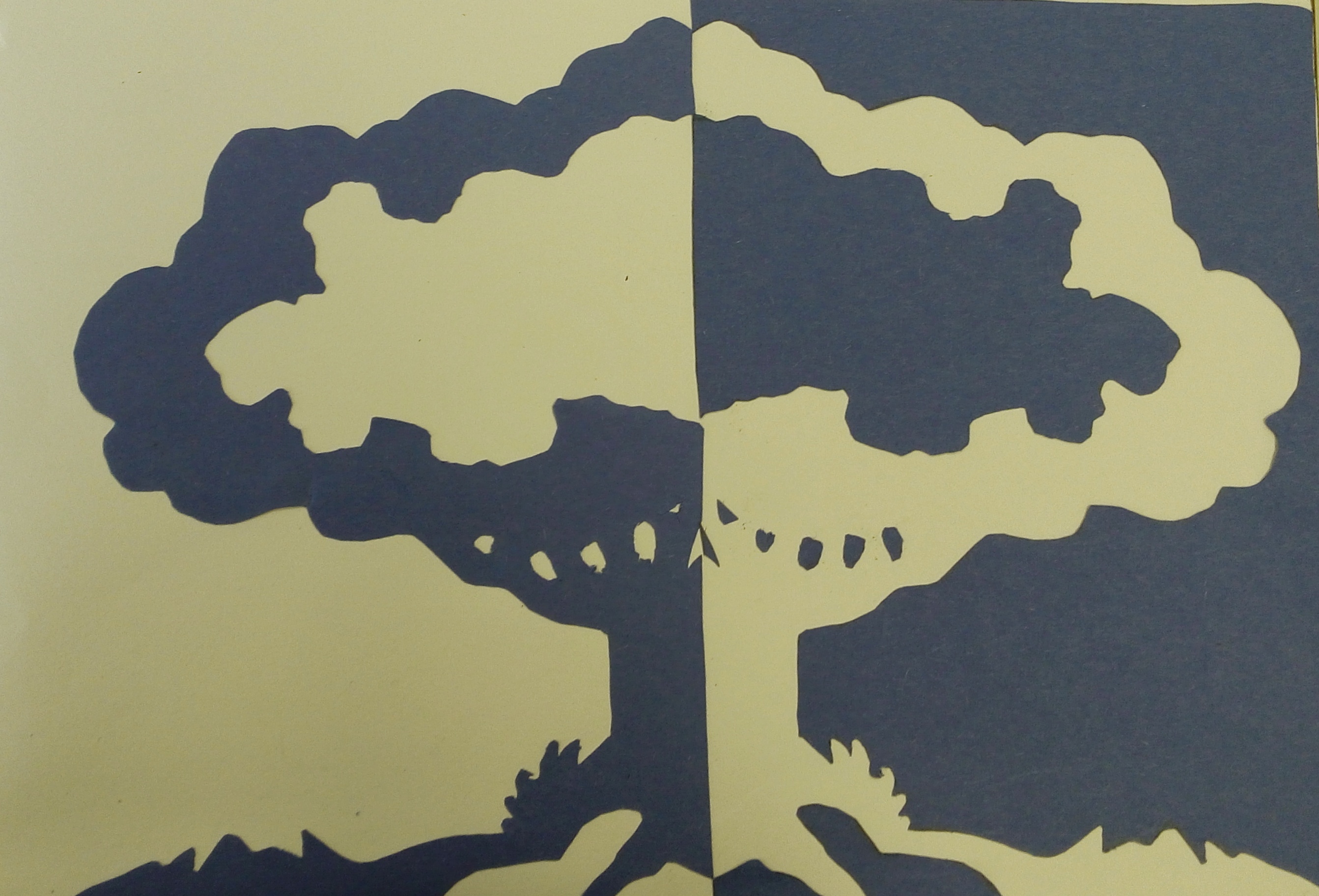 The first thing I did was cut out the pieces of the picture, since negative spacing is usually cut up in pieces. So in the artwork I did, I cut out the outer part of the tree(the tree bark and grass) and the inner parts of the tree(middle tree, middle tree holes, and bottom holes). After I cut out my pieces, I flipped the cut out pieces over and lined them up to make a whole tree. After that, I glued them to the paper. Finally, I was able to identify my negative spacing is the left half of the tree and my positive spacing is the right half of the tree.