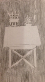 In my cut out, I found the negative space by cutting out the pieces that were shaded in darker and using that on the left side of the page so that the blue would be the focus and the black paper was the negative space. For the other side I did the complete opposite by cutting out the other part and then using the blue as the negative space. For the stool drawing, I drew the still life first and then colored in all the space around it.