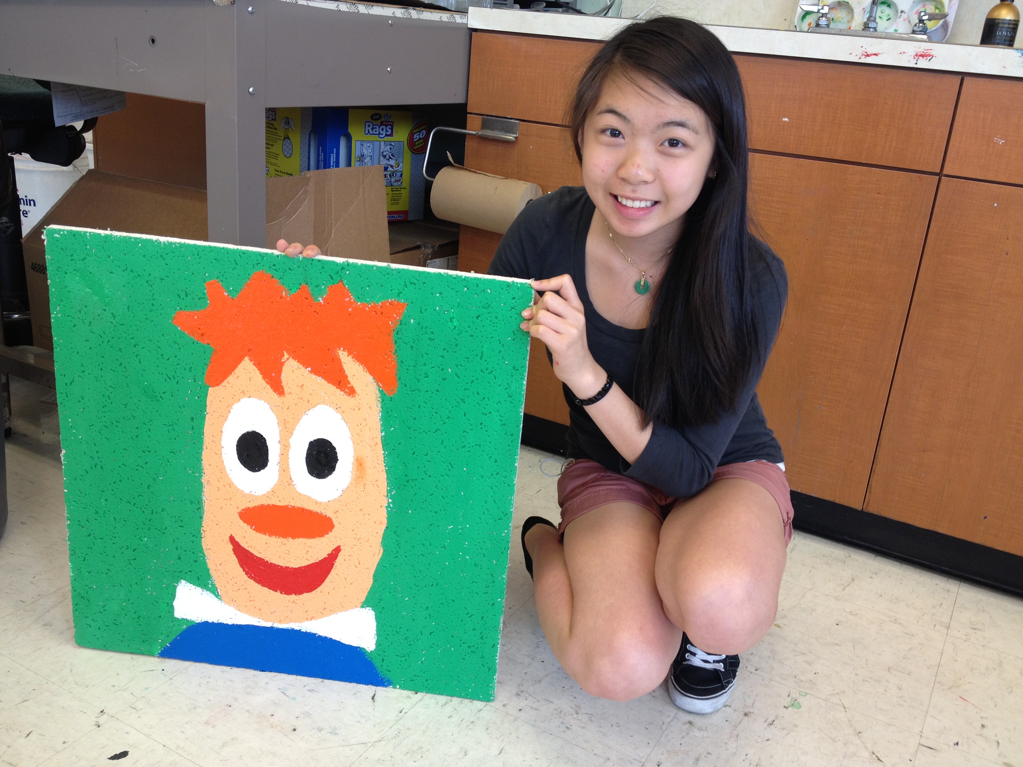 When choosing what to paint, I was so confused. I wanted to paint an elephant but I didn't want to show political status. Then I wanted to paint the sky but that was taken. I wanted to a panda but that would be hard. So I looked around the room and saw a character. Then I took my sharpie and started to free hand a face and messed up a lot. But I figured that I would be painting over it a few times so I didn't worry about it a lot. The next question was "which ceiling tile?"