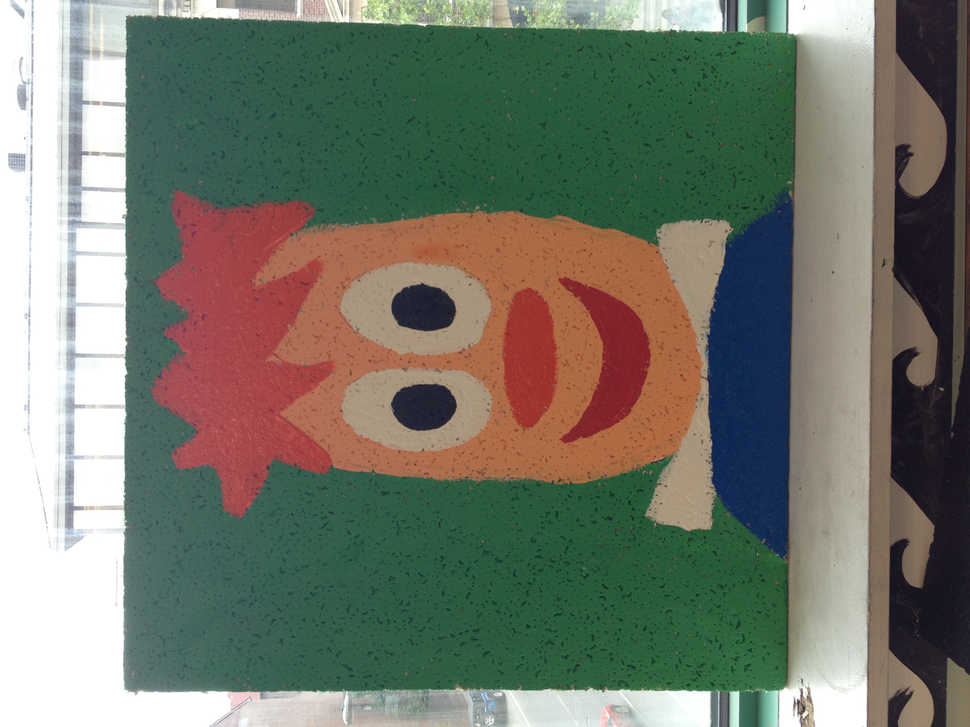 I first got my paint together and started to paint the background and the face. It was a little hard because it required a lot of paint and I had to fill in all of the holes in the ceiling tile. The whole process was pretty easy but too a lot of time and a lot of different size paint brushes.