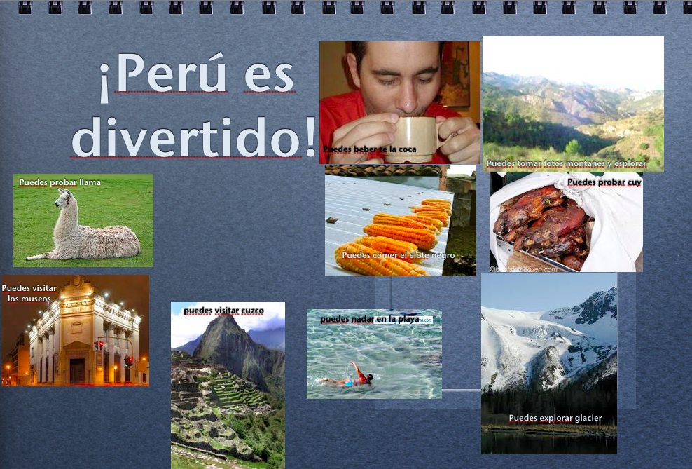 ¡Perú es divertido! Posted by Allen Harmon in Spanish 1 - Manuel on Monday, April 16, 2012 at 1:09 pm Screen Shot 2012-04-16 at 1.07.42 PM Comments No comments have been posted yet. Log in to post a comment.