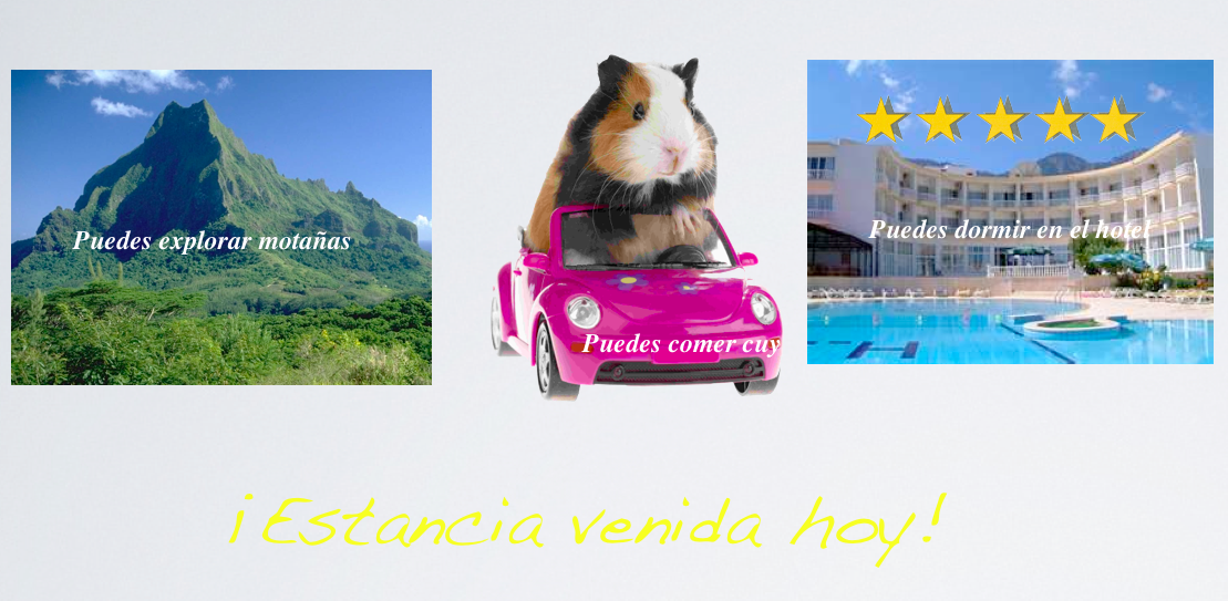 ¡Perù Es Fabuloso! Posted by Pierce Meier in Spanish 1 - Manuel on Monday, April 16, 2012 at 1:09 pm Screen Shot 2012-04-16 at 1.07.02 PM Comments No comments have been posted yet. Log in to post a comment.