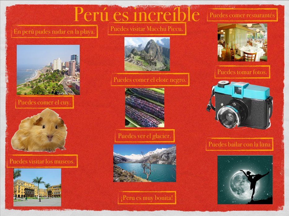 ¡Peru es incrediblé! de Ruby y Haji Posted by RubyJane Anderson in Spanish 1 - Manuel on Monday, April 16, 2012 at 1:19 pm Screen Shot 2012-04-16 at 1.16.09 PM Comments No comments have been posted yet. Log in to post a comment.