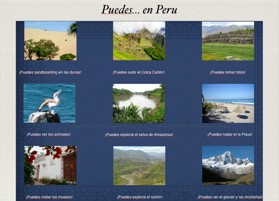 ¡Peru es super bastante hermoso! Posted by Alex Marothy in Spanish 1 - Manuel on Monday, April 16, 2012 at 1:03 pm Alejandro y ChrisScreen Shot 2012-04-16 at 1.02.33 PM Comments No comments have been posted yet. Log in to post a comment.