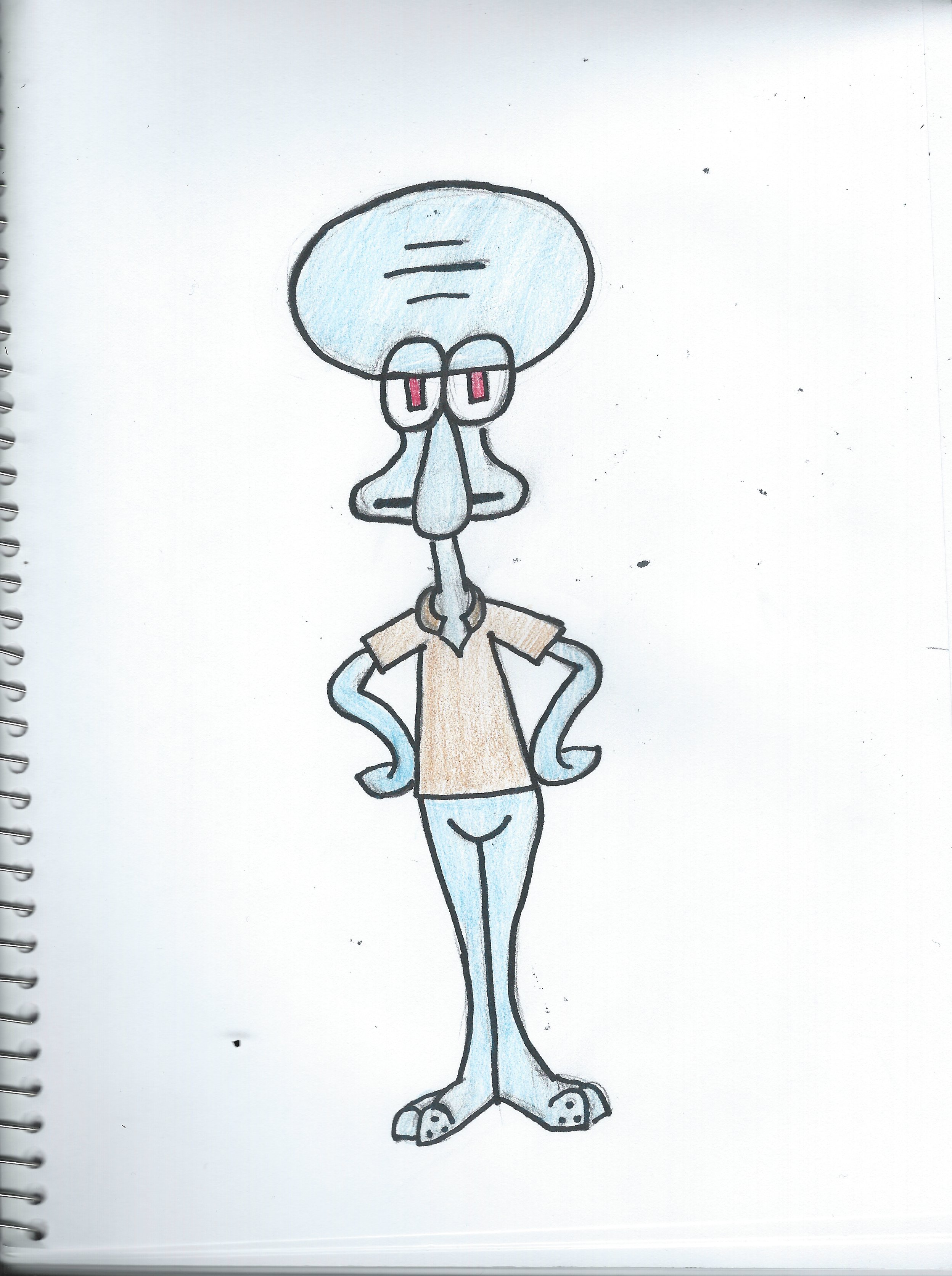 I really got into water colors this year, I am still trying my best the learn how to use them well, but this is what I did for Q2. I also made a tile of Louise from the FOX show bob's burgers, I feel like there is a little Louise in everyone that goes to SLA. She's a little edgy and speaks her mind, but is still I kid. As i was painting Louise I looked back to when I was younger I loved NICK, and really who didn't. Fairly Oddparent's was one of my favorite shows growing up, so I drew Cosmo from the show, the guy with the green hair. I remember when I was little I tried my little heart out trying to draw Sqiudward, from Sponge Bob. I was never real a fan of the show, I thought it was very dumb and had no morals to it at all. But I remember trying to draw him free hand it it was a mess, so now that I am sixteen I tried again free hand, no website helping me just drawing and I did it.