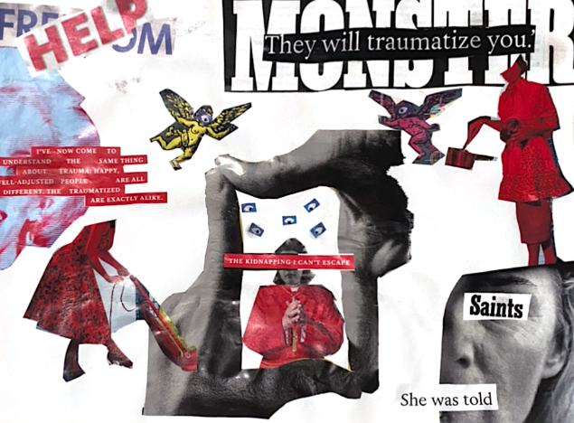 I added eyes on top of these angels in my artwork because I wanted to represent that they are both forms of restriction in Gilead. The rest of the images on my artwork mostly show how the women in Gilead are treated by the “hierarchy” which is being silenced. The picture of the woman on the left side. Her eyes are being covered by the words , “ive now come to understand the same thing about trauma :happy, well adjusted people are all different. The traumatized are exactly alike.” I wanted to represent how the women in Gilead are being silenced and brainwashed on their traumatic experiences when living and working in Gilead.