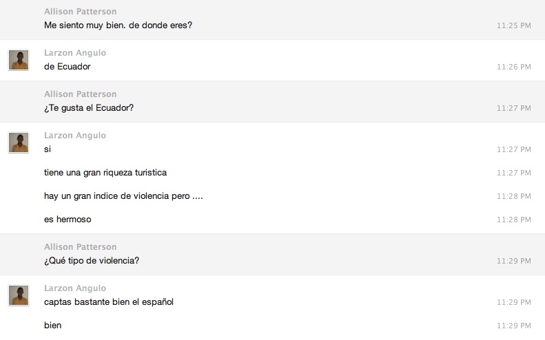 This week I had very interesting conversation with a friend from Ecuador. His name was Larzon Angulo and we began by speaking about where he was from and he brought up the amount of violence in Ecuador (avoid possibility offending him by asking about how violent his country is.) What I found most interesting was that Larzon asked me what I meant if he didn't understand my Spanish while my last two partners worked around it. I also helped Larzon learn some things in English for instance he called me "gentle" and I told him he should probably say kind. Larzon spoke about how people in Ecuador are poor because they want so much which is an idea that I think can connect to Americans as well. I found that as I spoke to Larzon he shared a lot of the ideas I had about America but with Ecuador. I was intrigued by this because I never thought to countries so far away from each other can be so similar.