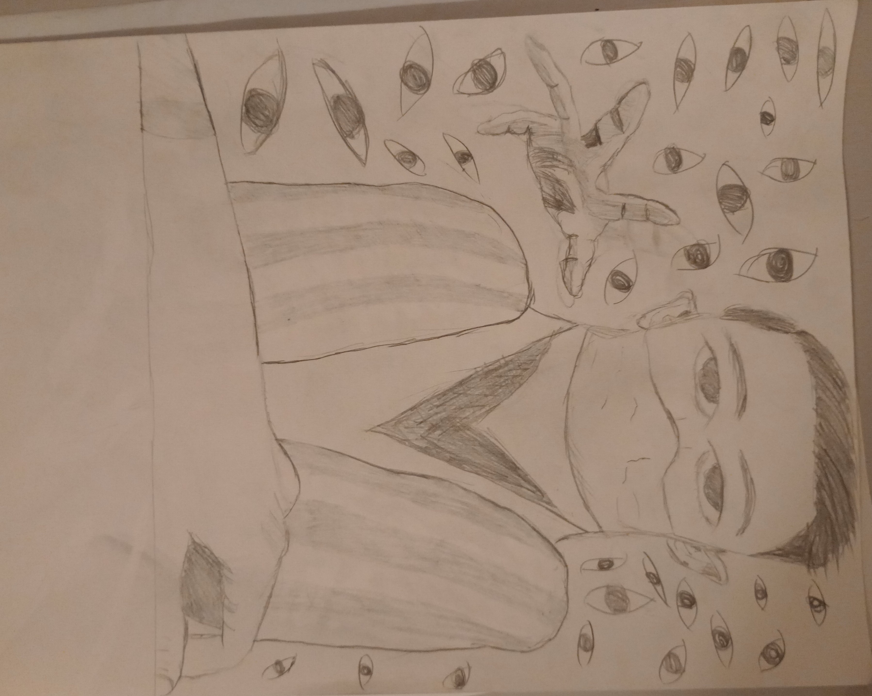 My artwork is about the scene with Offred and her doctor in chapter 11. This drawing is from the perspective of Offred when she is lying down on the examining table. The title “Pressed” is referring to how Offred is being physically pressured, with him literally pressing her body with his hand, and the eyes mentally putting pressure onto Offred. I used three references for my drawing. The first reference is for the first person perspective. It was from a photo of a patient point of view lying on a medical bed. The patient in the picture was wearing pants with stripes and I had originally drawn the picture with the stripes on Offred’s pants. I later on removed the stripes and pants because Offred was completely naked in this scene. The bottom of the artwork is black because she is naked and I can’t draw anything. I also had to remove the sleeve the patient had in the photo. The second reference I used was of a doctor with a mask. The picture worked really well as a reference because of how similar the characteristics of the doctor in the photo and the doctor in “The Handmaid’s Tale” were. The doctors both had a white mask on and had brown hair. Although I didn’t use color in my drawing, it was still easier for me to draw because of this. I didn’t use color in my drawing for any particular reason. The third reference I used was a frame from a scene of “Demon Slayer”. The hand was of a demon and it was the shot I felt was what would come across as creepy. The hand of a demon was also supposed to have it represent how the doctor’s actions are inhumane. The doctor is pretending to come across as friendly but is also doing this purely for his own pleasure. The demon from the show is narcissistic in the same way as the doctor. I wasn’t able to have the hand turn out exactly as I wanted but I still think it comes across as a creepy grasp. I didn’t draw anything past a small part of the doctor’s chest because I didn’t have any more room but I still think that the floating hand of the doctor comes across as intended. The eyes all around are representing Offred’s feeling of worry. Offred worries about if someone can see them. On page 61, Offred says “What are the odds, is the room bugged, who’s waiting just outside the door?” The fear of being caught by people who are eyes is also meant to be shown through the eyes around the room. Offred in this scene is the one who is being violated and yet she is in a situation in which she would be punished if someone saw. She is the victim but there is no help. A person with higher power is taking advantage of her situation for his own personal pleasure. The feeling of being pressured and helpless. The feeling of no one being on your side. The feeling of wrongfully being in the wrong as the victim. These feelings that Offred had to endure are what I wanted to express through this drawing. The terrifying perspective of a woman in Gilead and to remember how people feel this way in our world today.