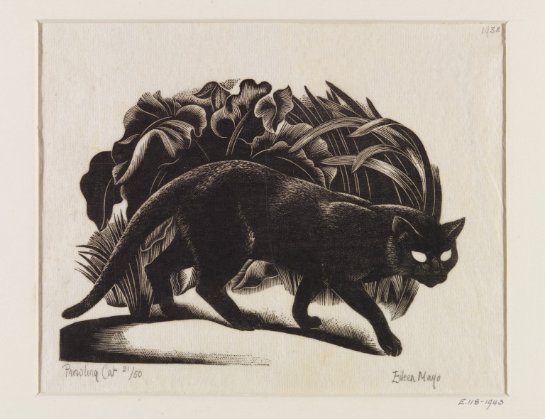 The above image is a woodcut print titled "Prowling Cat" by Eileen Mayo. (source) This pictures a short hair, solid colored cat "prowling" around in deep grass. It also seems to be passing a leafy plant. As for specifics, the cat has no visible pupils and has its right front paw raised, mid step. However, I notice that most of the movement of this piece is not in the step. Starting from the nose-- as the eye is drawn to the most intense empty space of the print-- the viewer is almost pulled up through the face and into the bend of the grass, guided back down into the back-- as all the grass seems to point in that direction-- and then ushered down the tail. It is rather incredible how Mayo is able to guide the eye around the piece with organic shapes, which does not push us to travel too fast. The tiny flecks of white around the cat's fur to show difference almost require time to for us to see the muscle and build of the feline. this print is extremely well done, as it suggests so much movement, not only in the cat, but in our own eyes. The simplicity of the cat and it's empty eyes also leave the viewer space to interpret what the cat is actually doing. We may wonder, what are its motives? Is it hunting? Or just enjoying a warm day?