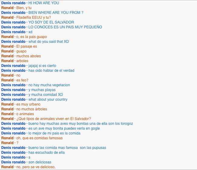 My partner taught me that food in Salvador is much like food in America, with some minor differences (like how it is prepared). I learned that my partner is a very enthusiastic person, although he did sometimes tend to loose interest in the chat. I learned that I enjoy talking to others, as the conversation lasted for a while once again. As we spoke more and more, I became increasingly interested in his cultural traditions. Once again, I was surprised that my partner was so friendly. If someone tried to chat with me about a school project, I doubt that I would be as cooperative as he was. I am proud that I learned something about food from the chat, as trying new foods can be a fun experience. I had a fear that my partner would suddenly exit the chat from boredom. Luckily, this did not happen. Next time, I plan to ask more probing questions.