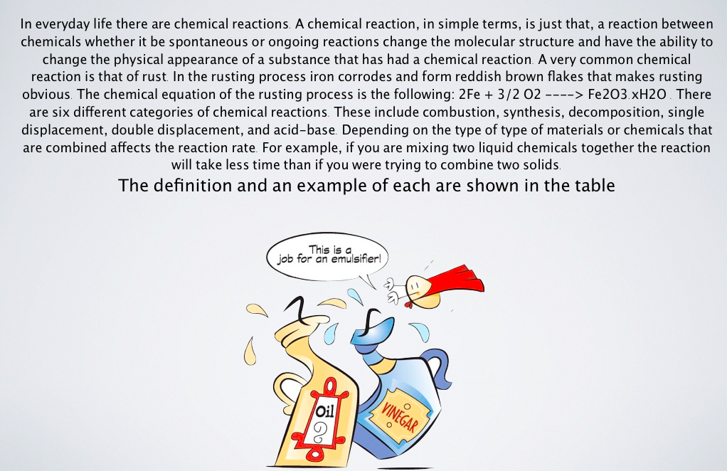 PSSA Chemical Reactions - Cheyenne Pagan Posted by Cheyenne Pagan in Physics - Echols on Saturday, April 28, 2012 at 4:43 pm Screen Shot 2012-04-24 at 7.25.45 PMScreen Shot 2012-04-24 at 6.41.15 PMScreen Shot 2012-04-28 at 4.41.50 PM(n.d.). Retrieved from http://misterguch.brinkster.net/6typesofchemicalrxn.html Comments No comments have been posted yet. Log in to post a comment.