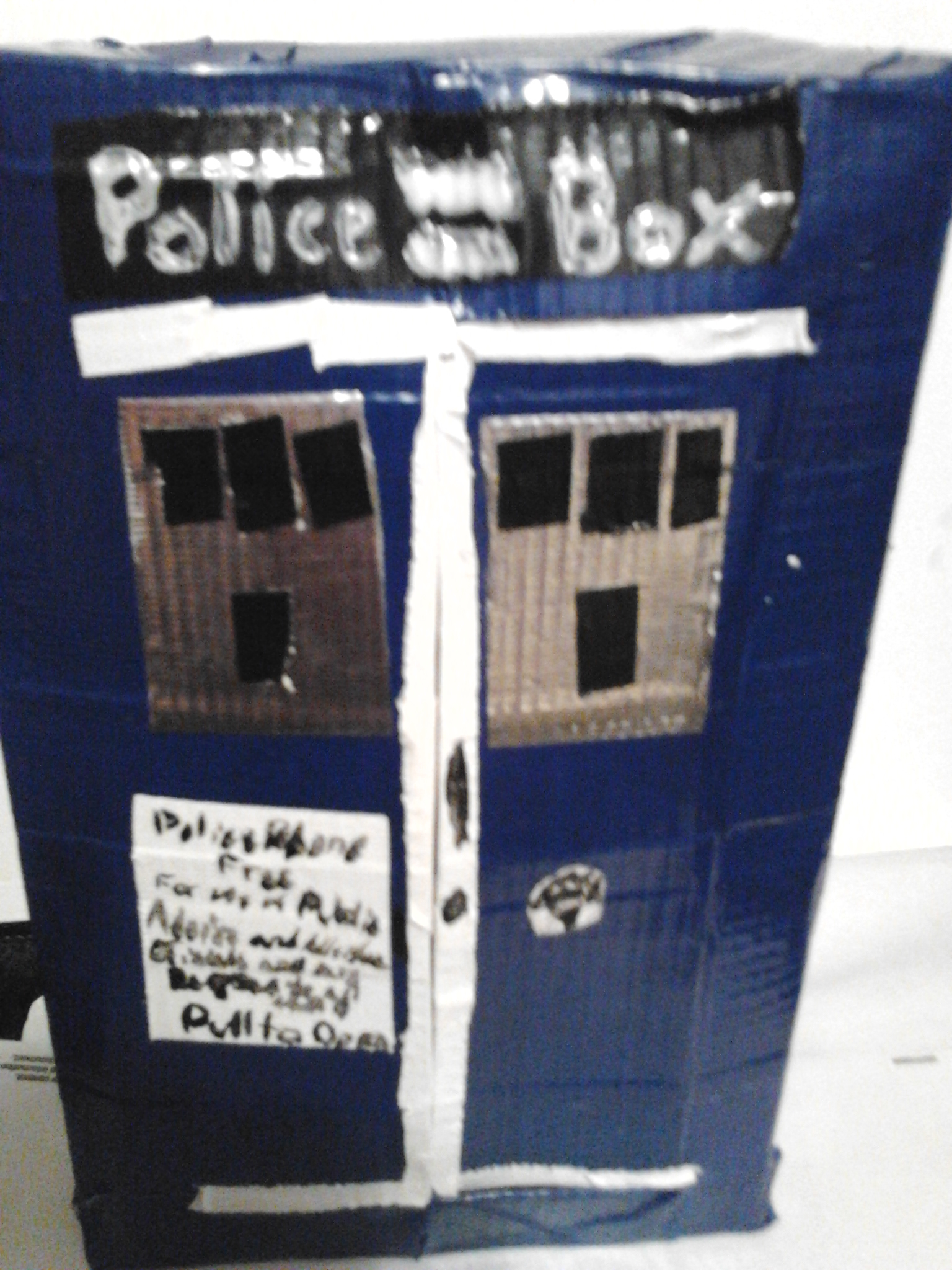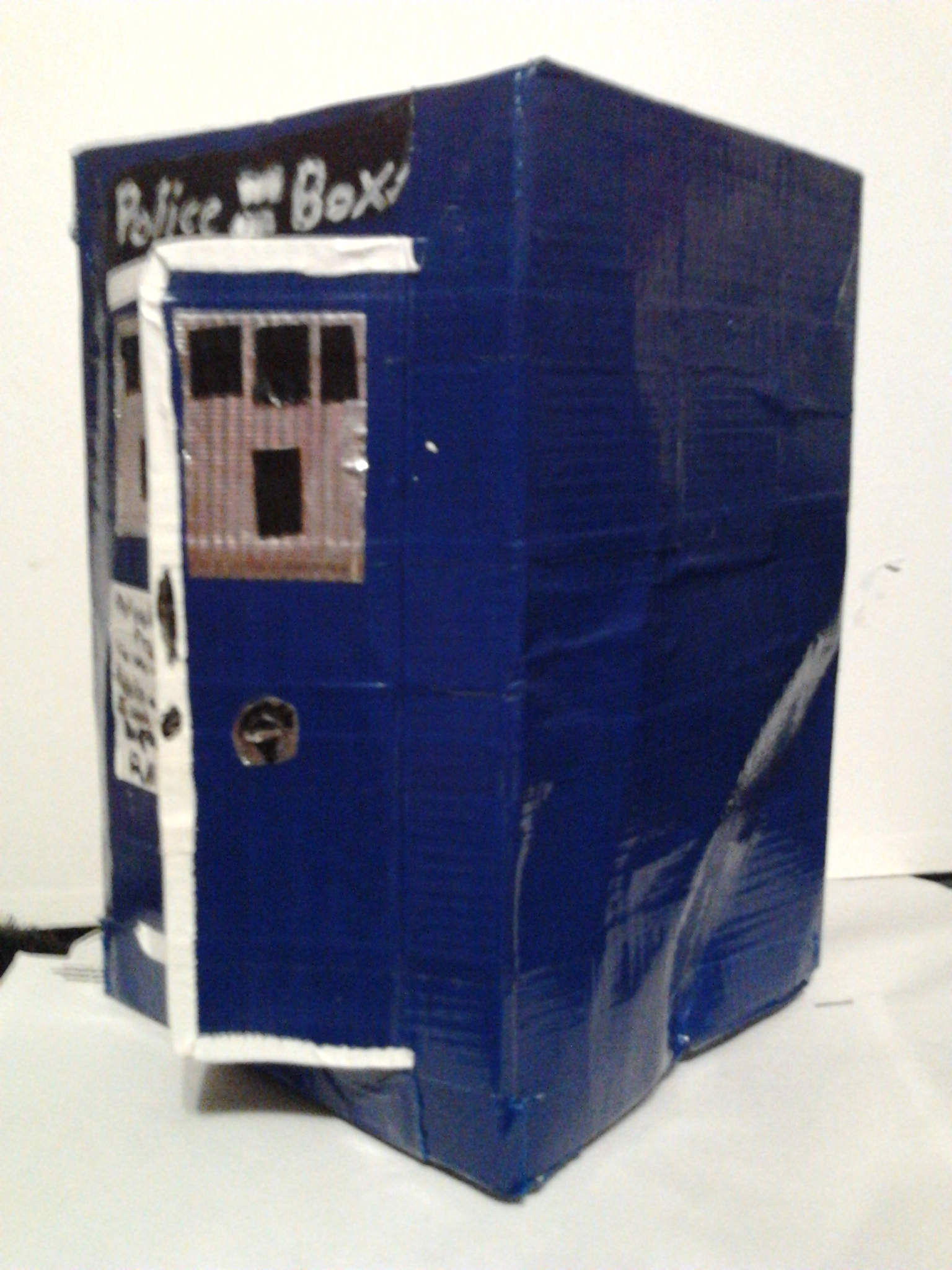 T.A.R.D.I.S from the BBC show Doctor Who and it stands for Time And Relative Dimension(s) In Space. It was hard to get a light to stick to the top; it kept falling off.