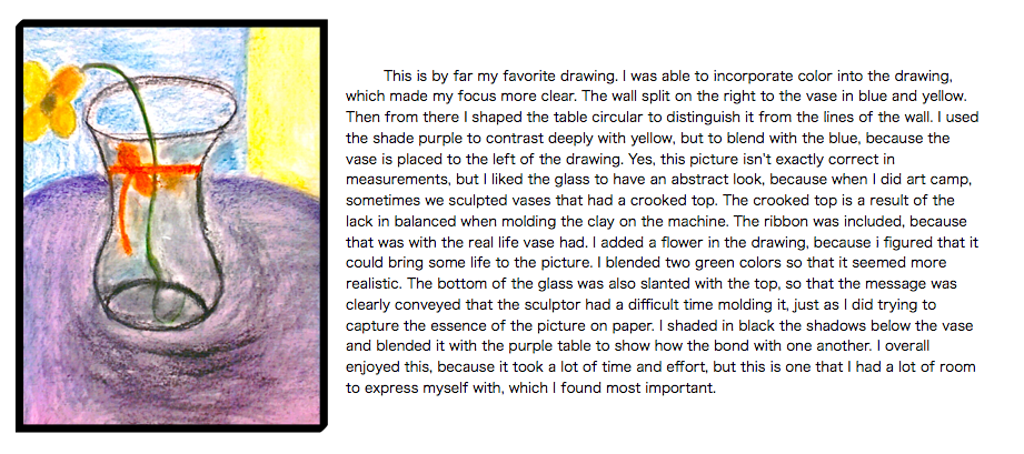 The photos include my artist statements about the photos next to the final pictures. I think the instructor could have done a better job with paying the students more individual attention or taking time to ask us as a class how we feel about drawing the different assignments. A drawing per week was a little bit too much, but in the end I did the best that I could. One thing I could have done better was to seek for help with the drawings, however I am more personal about my work. Also the skill requirement for the quarter was a little high, so the expectations were higher. I did better than I expected, but I guess I could have done better by balancing my elective with other classes so that I could devote more time into these projects. With some of these, I feel that the class needed more time to do it, more instruction and more support. It would have been nice to have a break in between drawing- or something different that still counted as an art piece to show our own creativity.