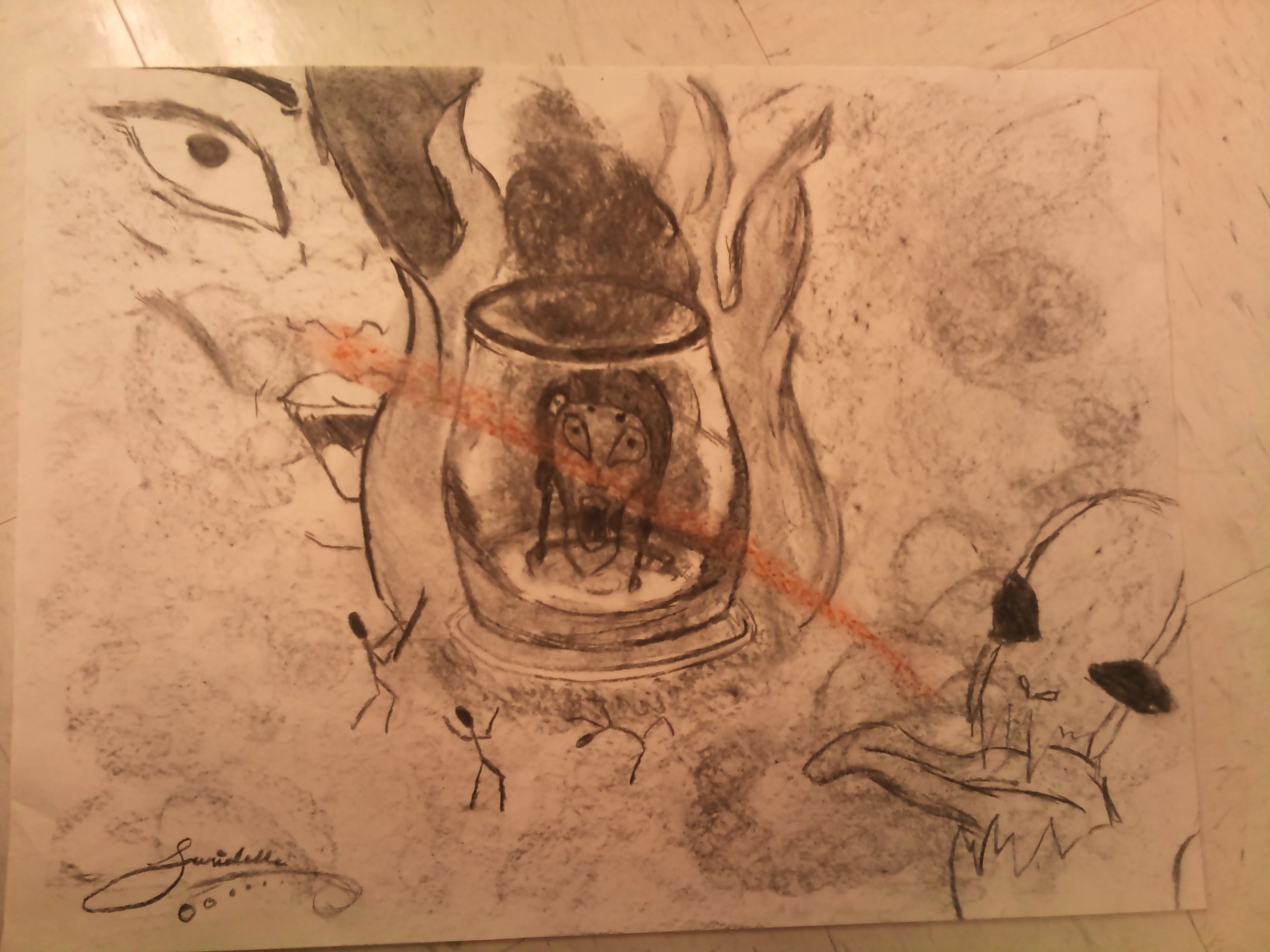 With this picture, we were told to use charcoal to draw a clear object. So, I took my charcoal and 20 minutes in, I had a decent looking see through glass cup. The only problem was that it was a plain, simple, see through glass cup at the center of a very large piece of paper. It just seemed, like the previous picture, that it needed more. So I gave it more. First I drew the random flames in the back of the vase and then the smoke that goes from inside of the glass out. Spacing out for a moment, I noticed that I could see one of my friends through the glass. Inspired by seeing him, I decided to draw him in the glass. Feeling silly, I drew him to look like a face from a famous painting called "Scream". Out of boredom I added all the extra jazz around the outside of the glass and ended up with this abstract and morbid picture.