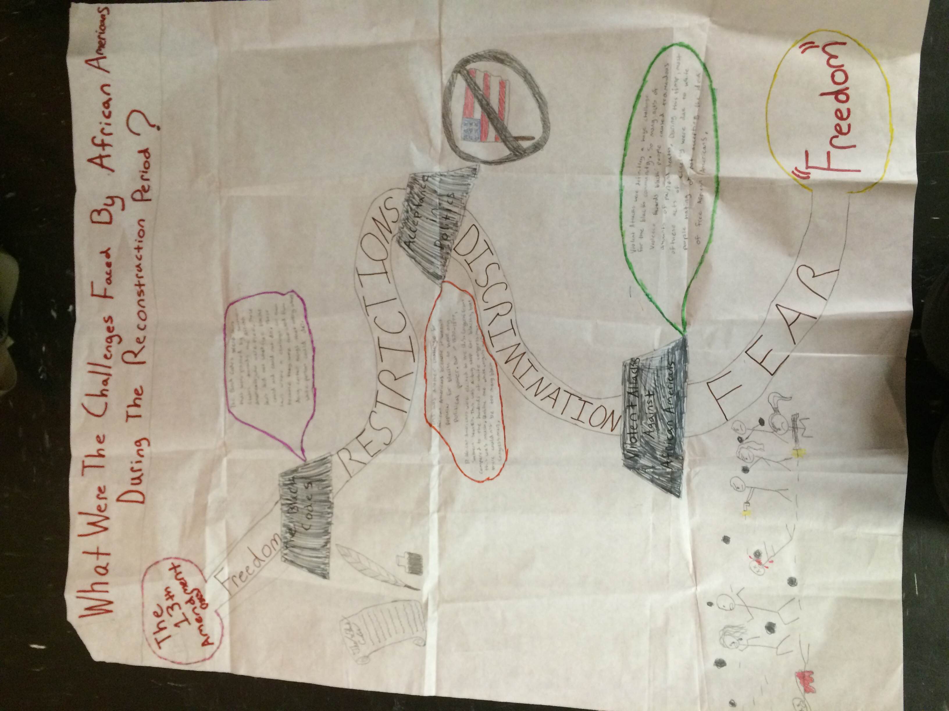 Before I get into my concept map, I have to say that I feel pretty proud of my work. I really enjoyed how I got to put all of my creativity and imagination into this great work of art. I hope you enjoy this masterpiece as much as I do. As you examine my concept map, you will see that on the paths there are large words written on them. These words are basically summarizing what it was like for most black people to have to go through these tough challenges during the reconstruction period. The next thing you will see on my map that might be confusing is the thirteenth amendment being the start of my map. The thirteenth amendment is the start of my map because this amendment abolished slavery and involuntary servitude, except as punishment for a crime. Another thing on my map that might not be entirely clear to some people is the word freedom with quotation marks around it. I have added quotation marks around the word freedom because even after all the challenges that they endured, they still weren't truly free. The thirteenth amendment might have started the path to freedom for all free blacks, but not every white person agreed with this idea. For this is the reason why free black people were not truly free. My map matters because it gives it's viewers a quick run down of the three huge challenges that African Americans faced during the reconstruction period. Without hearing long lechures and reading long articles. My map has meaning for the study of the Reconstruction era because the three challenges on my map played huge roles during the time of reconstruction.