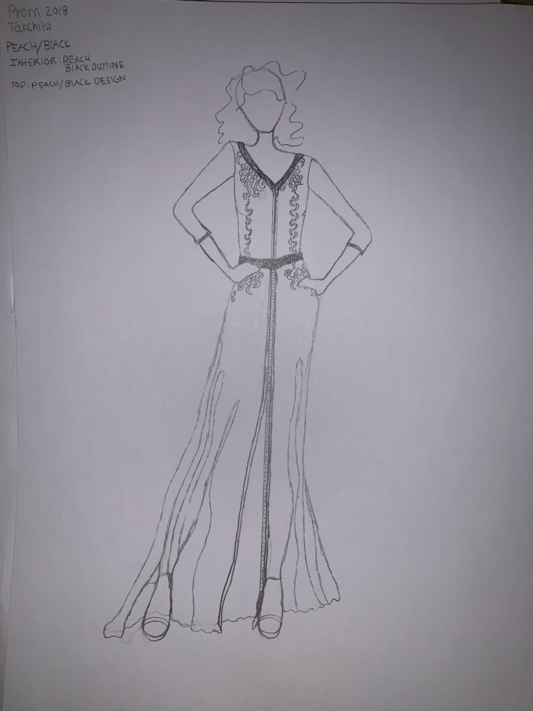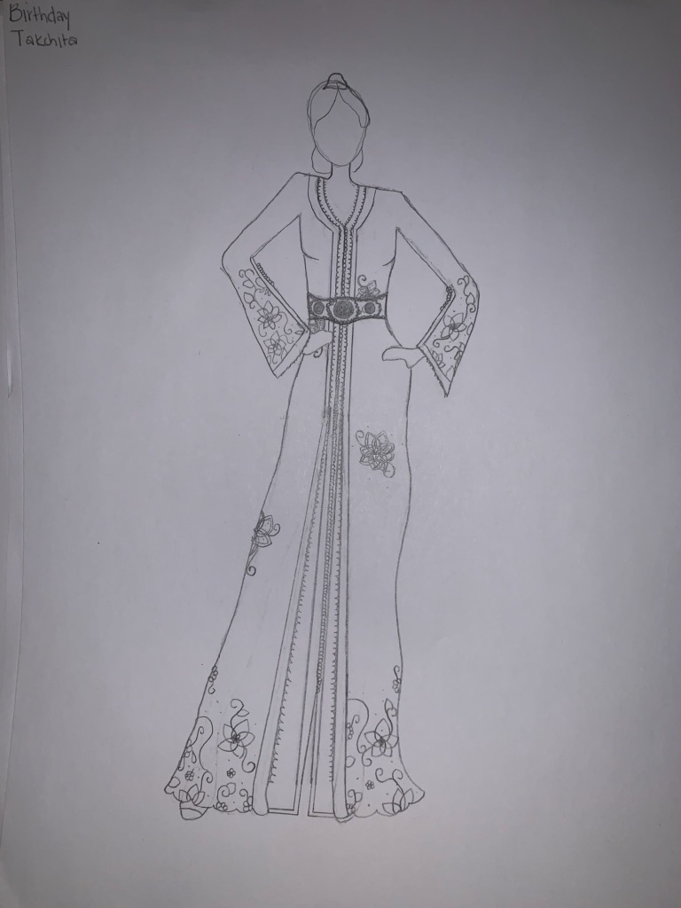 For my senior capstone I was inspired to design Moroccan Takchitas that are shown below in order to display the talent I have not only in art but in design as a whole. I also decided to do this in order to share my culture with the SLA community and educate students who have little knowledge about Northern African fashion that is mainly based on tradition.