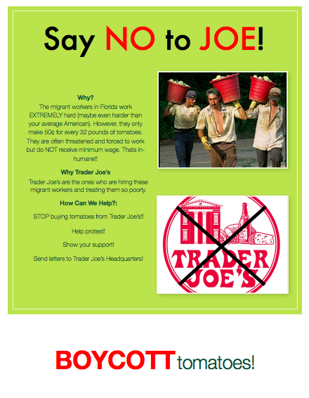 The migrant workers in Florida work EXTREMELY hard (maybe even harder than your average American). However, they only make 50¢ for every 32 pounds of tomatoes. They are often threatened and forced to work but do NOT receive minimum wage. Thats in-humane!!